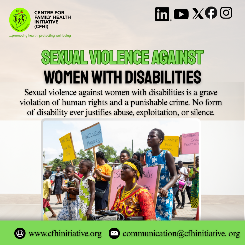 At the Centre for Family Health Initiative (CFHI), addressing violence against women especially among vulnerable populations like women with disabilities is integral to our community health work. CFHI integrates gender-based violence awareness and response into school and community engagements, ensuring that information on rights, reporting pathways, and support services reaches diverse audiences. Through partnerships with health facilities, community leaders, and referral networks, CFHI also supports safe and confidential reporting channels, linking survivors to medical care, psychosocial support, and legal aid where available. By advocating for inclusive prevention strategies and survivor-centred responses, CFHI reinforces that violence against women with disabilities is not inevitable it is preventable and must be confronted collectively.